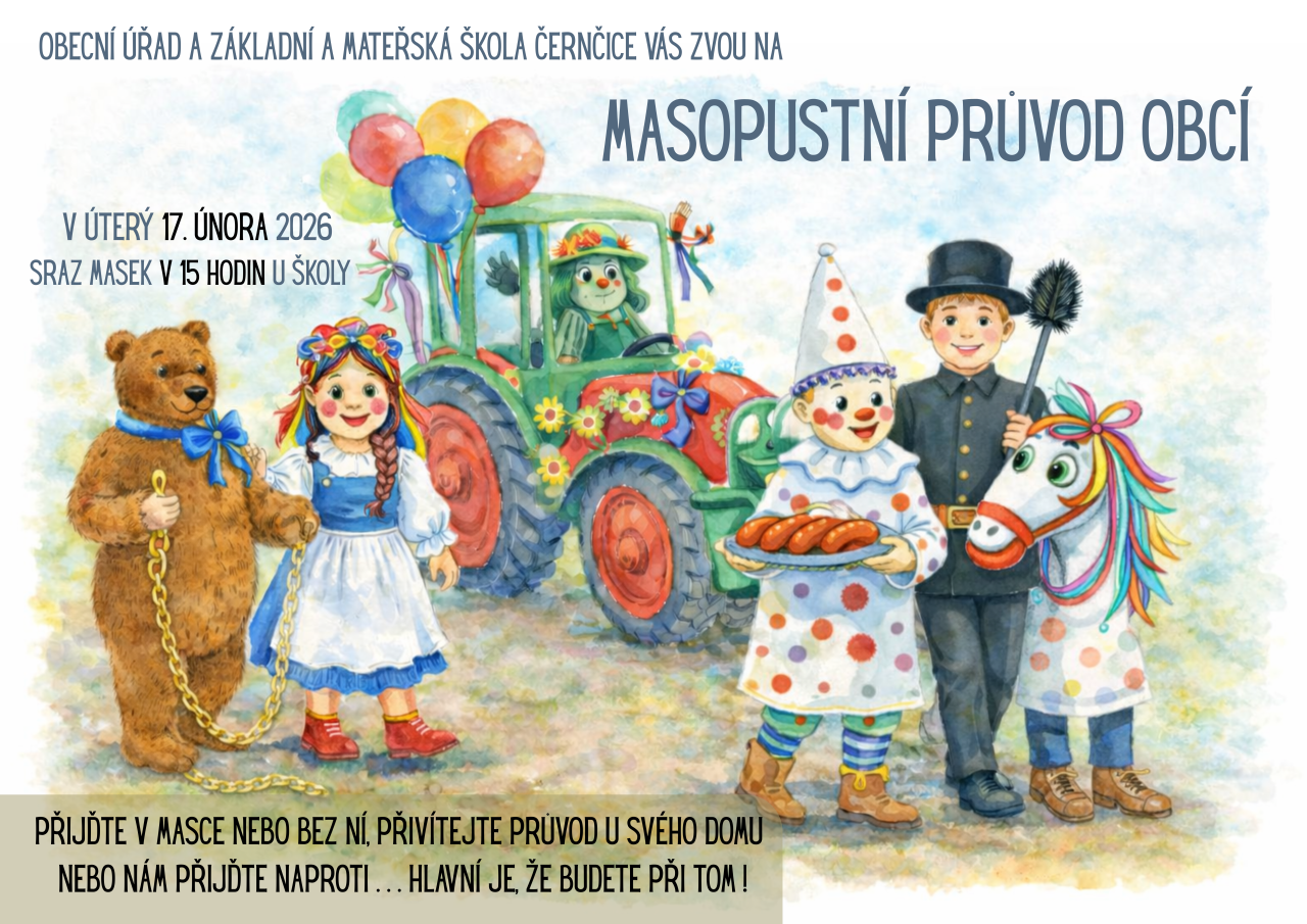 Obecní úřad a Základní a mateřská škola Černčice zvou všechny obyvatele na masopustní průvod. Ten se uskuteční v úterý 17. února 2026, sraz masek je naplánován na 15 hodin u školy. Přijďte oslavit tuto tradiční akci, ať už v maskách nebo bez nich. Hlavním cílem je společně se setkat a užít si radostnou atmosféru.