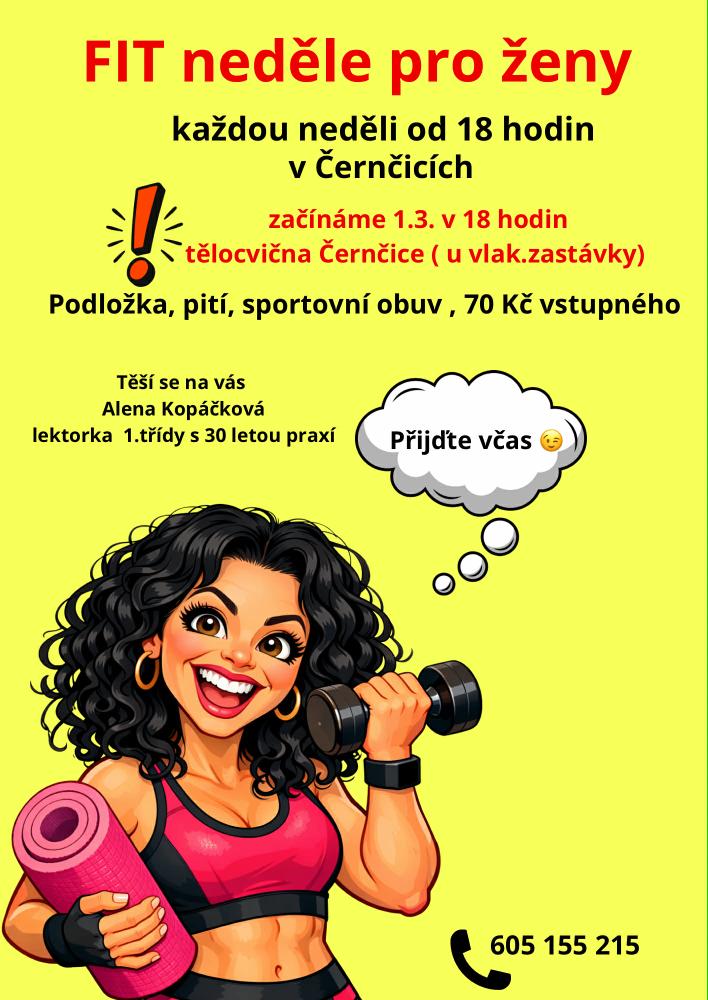 V Černčicích se od 1. března 2026 konají FIT neděle určené pro ženy. Akce probíhá každou neděli v tělocvičně od 18 hodin. Účastnice si s sebou přinesou podložku, ručník, pití a pohodlné oblečení. Cena je 70 Kč. Tato aktivita je skvělou příležitostí, jak se hýbat a užít si společný čas, bez ohledu na úroveň zkušeností.