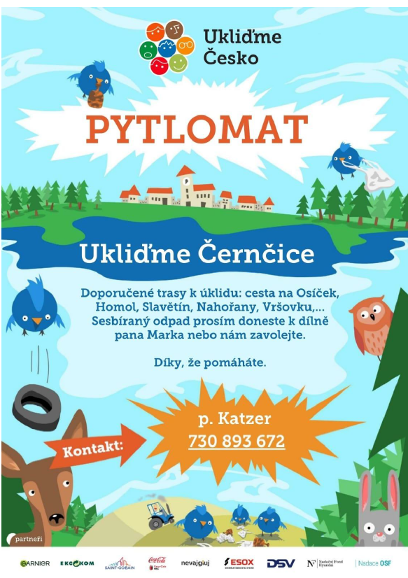 Pro všechny dobrovolníky, kterým není jedno, jak naše okolí vypadá, je možnost se od nyní do půlky dubna zapojit do celorepublikové akce UKLIĎME ČESKO. Pytle na odpad a rukavice jsou k dispozici na obecním úřadě. Naplněné pytle uložte k dílně za školkou u pana Marka. Vhodné trasy k úklidu jsou v letáčku anebo konzultujte s paní Markétou Poláčkovou tel. 608 205 934.