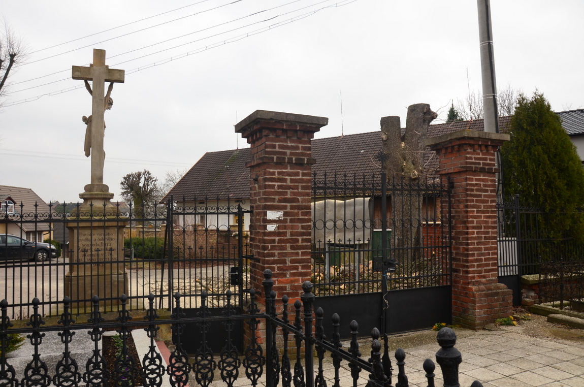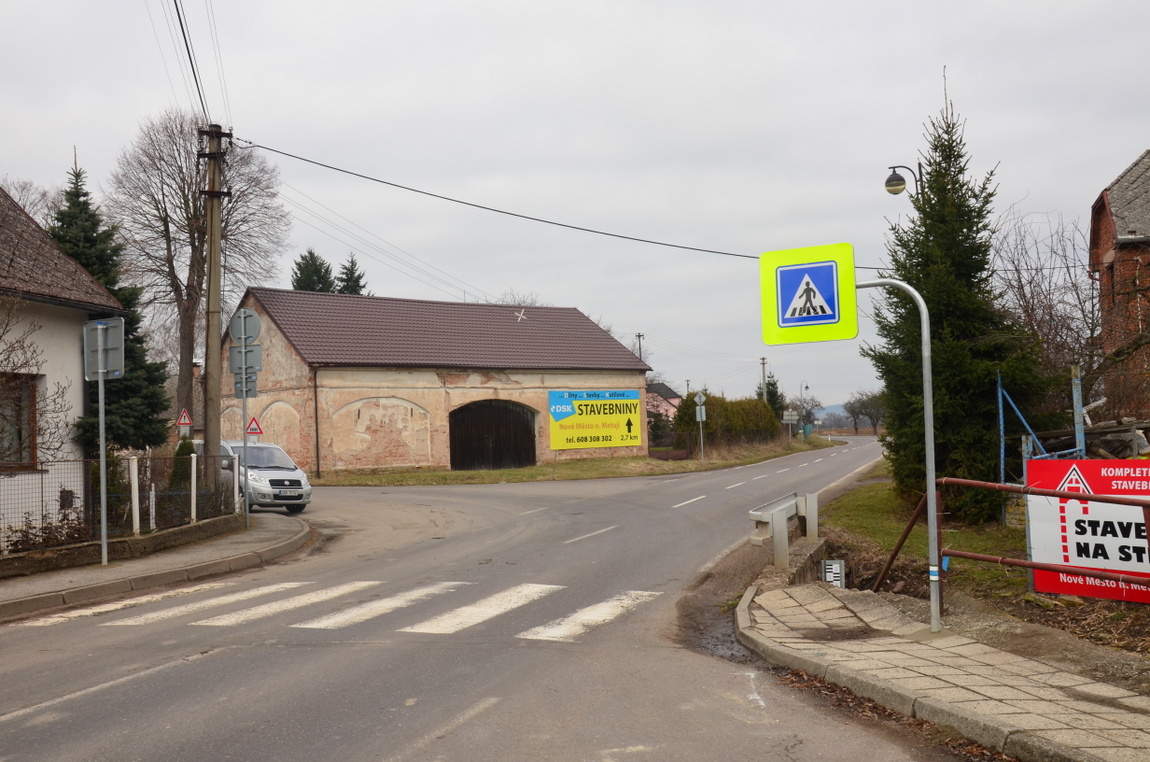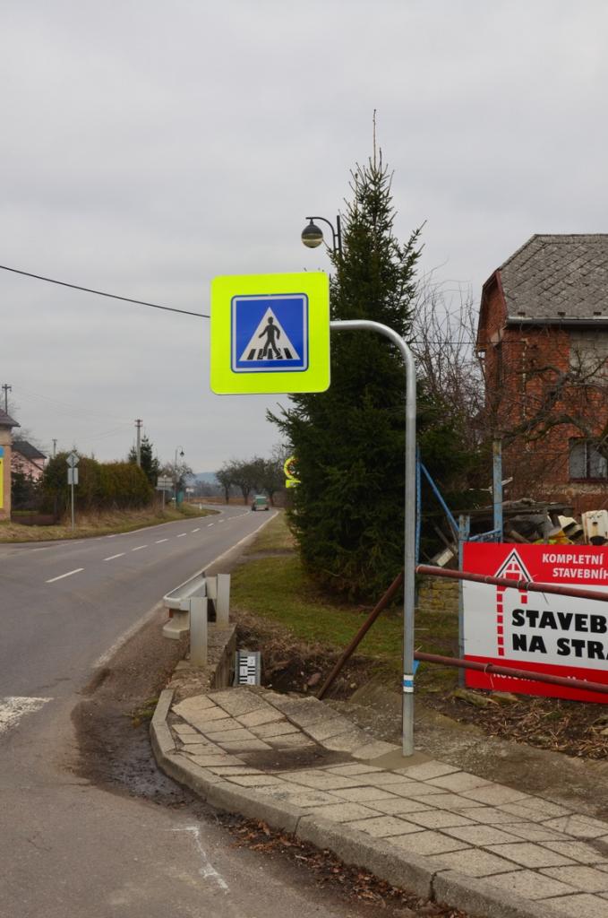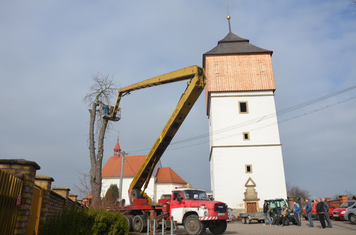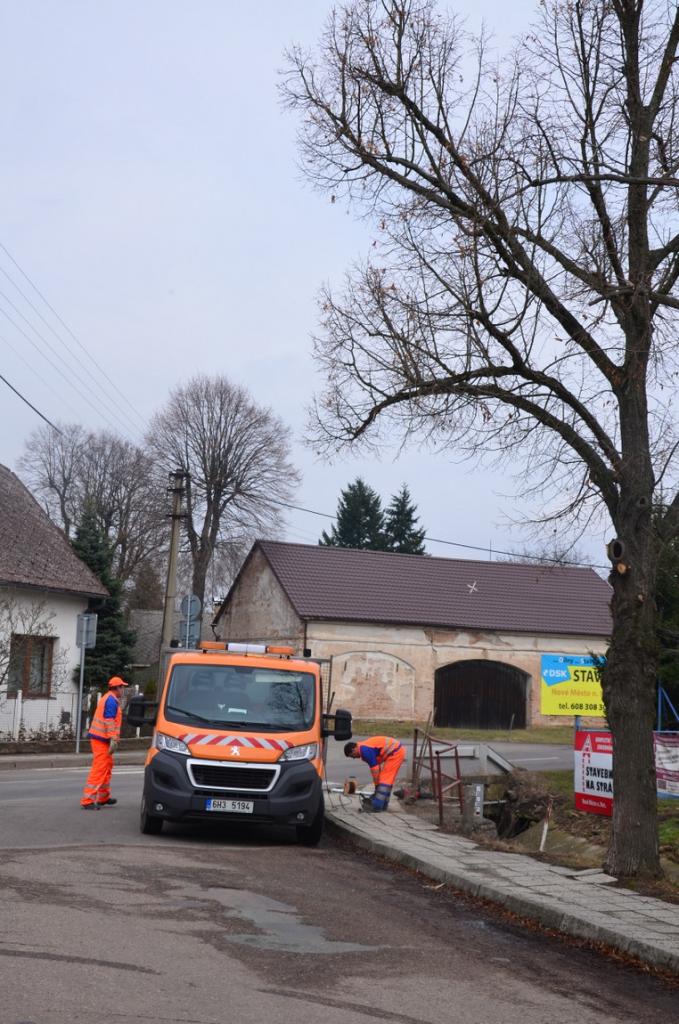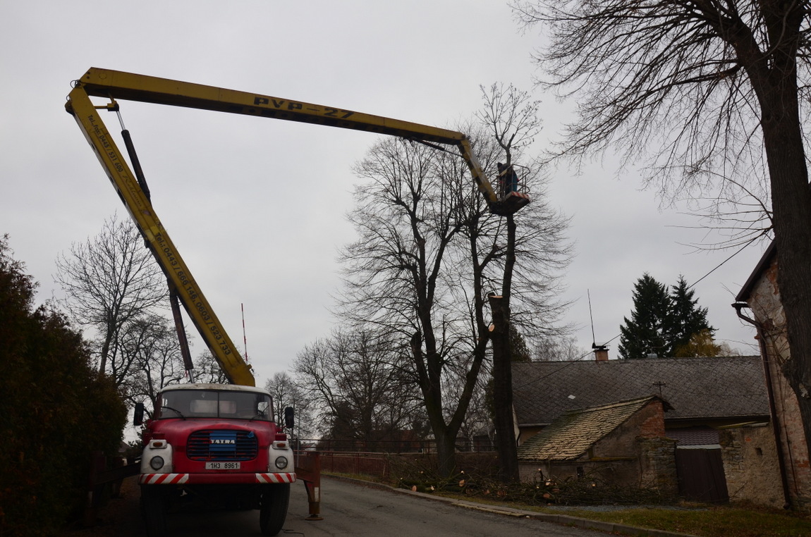 Kácení starých stromů a dopravní značení u hlavní silnice.
