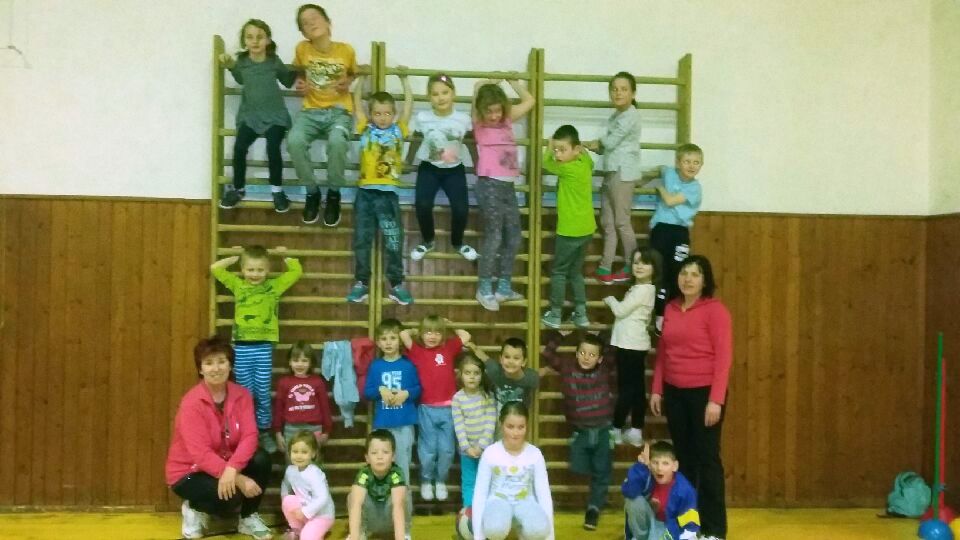 Cvičení dětí pod vedením L.Matoušové a H.Netíkové. V tomto roce má cvičení velkou oblibu, pravidelně dochází každé úterý do tělocvičny více jak 20 dětí.