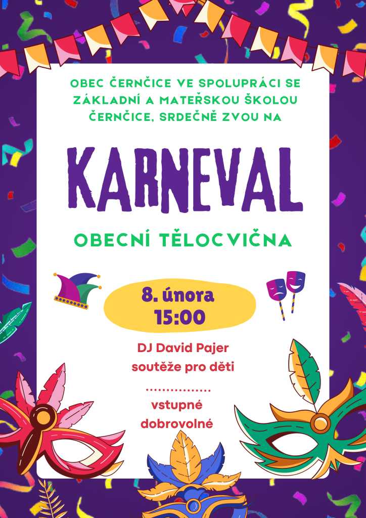 Karneval, pořádaný obcí Černčice ve spolupráci se Základní a Mateřskou školou, proběhne v obecní tělocvičně v neděli 8.února od 15h. Zveme všechny k účasti na této zábavné akci, kde si užijete odpoledne plné her a soutěží. Vstupné dobrovolné